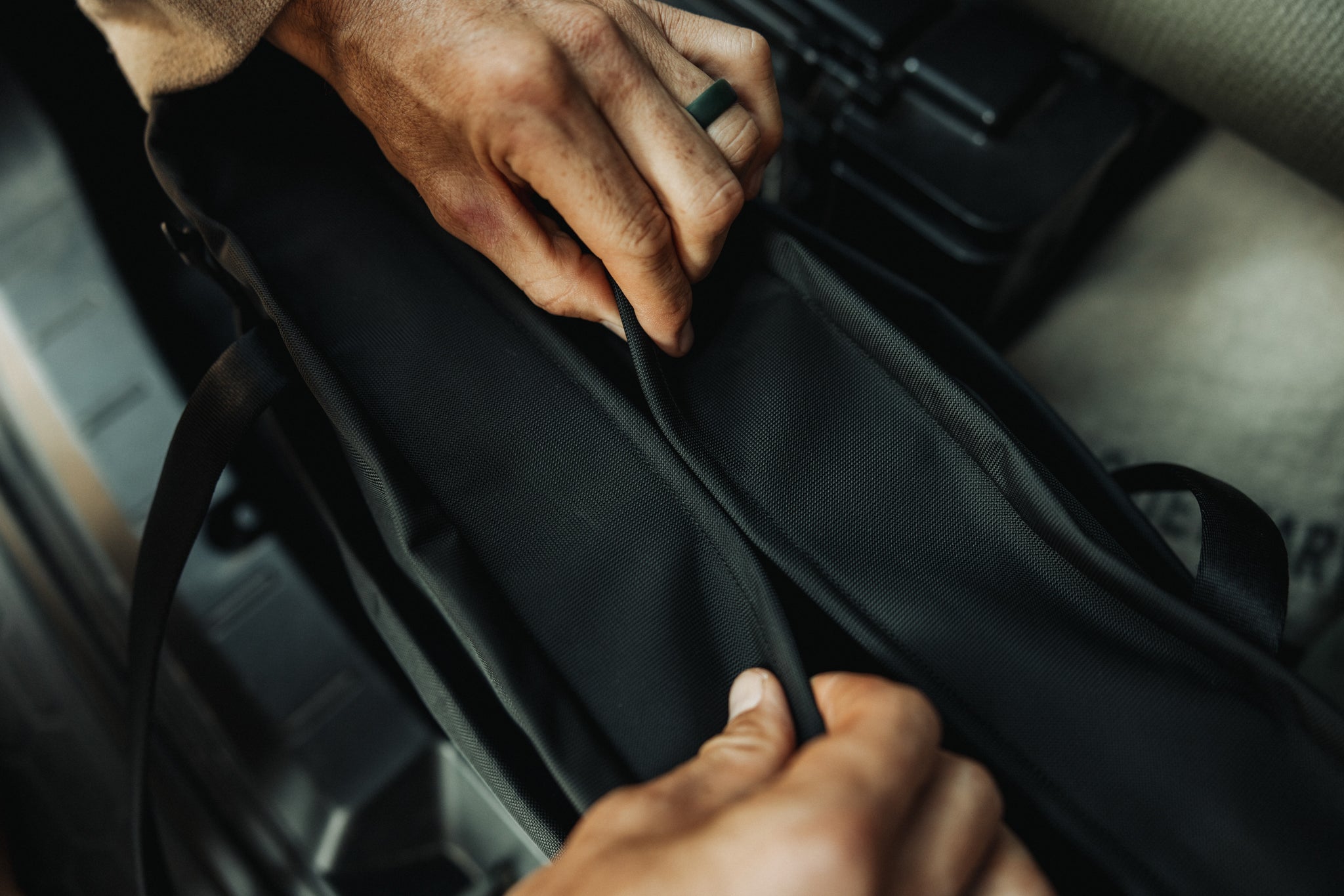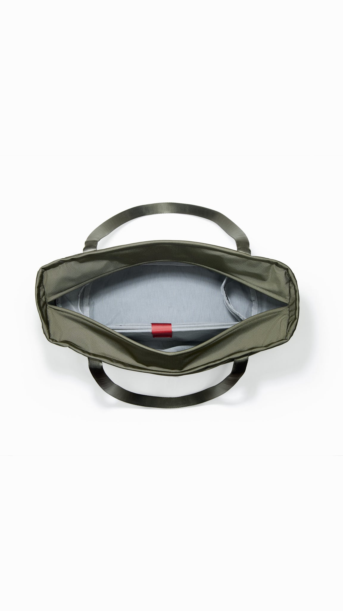 2本のハンドルは特注のチューブラーナイロンウェビング製で、芯材にフォームを使用することにより、手持ちでも肩掛けでも快適です。各ハンドルの頂点には薄型マグネットが3個ずつ内蔵され、ハンドル同士が支え合い、揃った状態でキープするので、いつでもすぐに持ち上げられます。