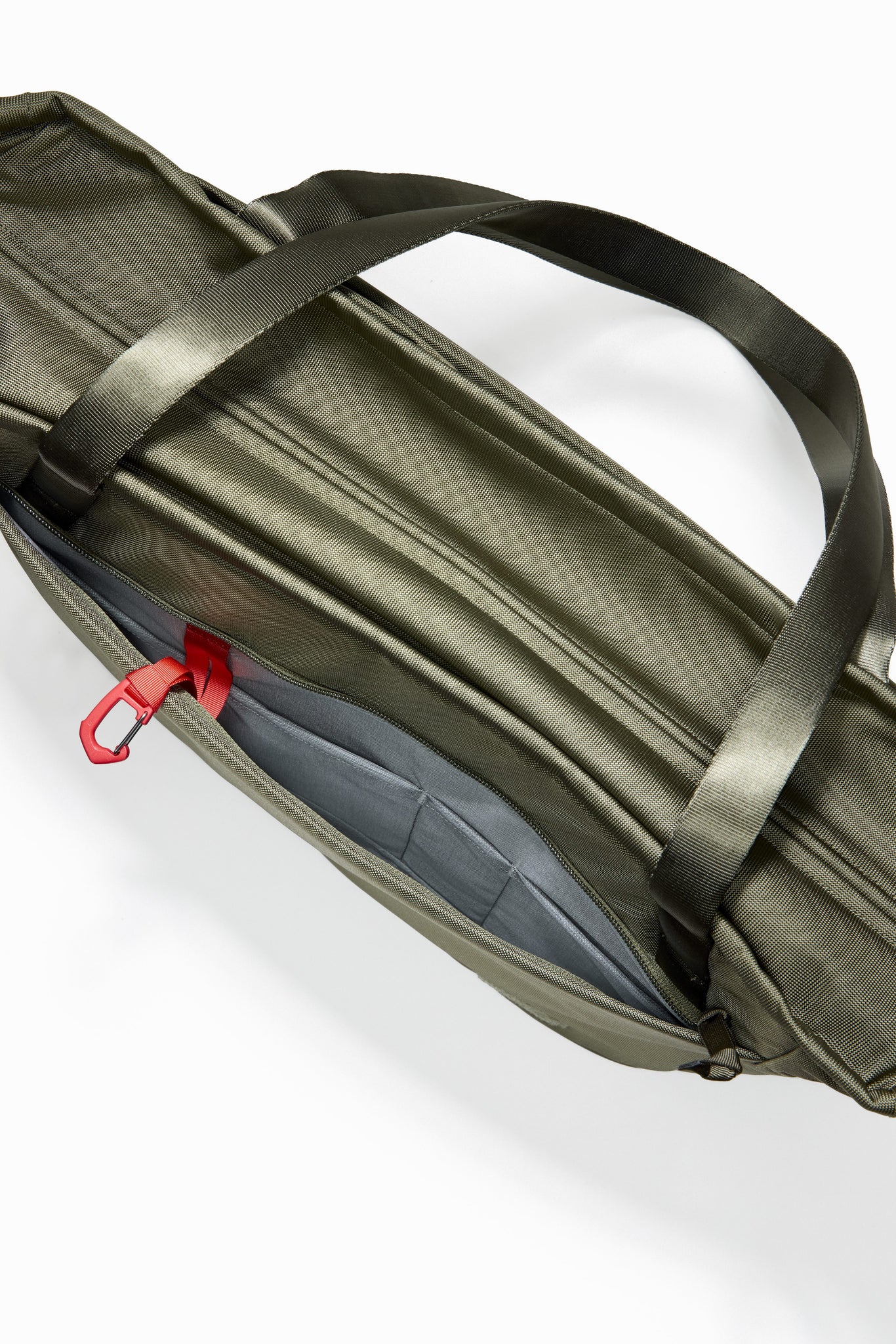 ・ハンドルの根元にバータックで補強されたループを合計4つ配置し、カラビナやIDタグなどをクリップ可能